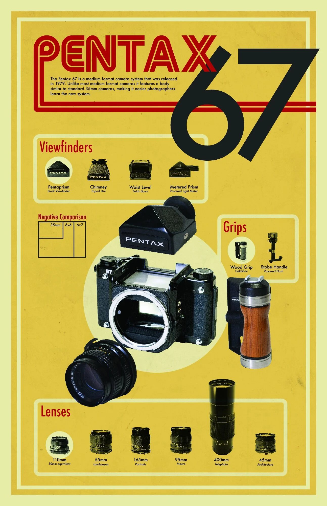 Getting up to speed on how to use a medium format camera can be daunting, and I was only able to work it out through trial and error. I wanted to create an infographic that would help a new fan parse through the many vintage lenses and accessories available. Of particular interest are the lenses, which going by the names don't line up with a traditional 35mm camera equivalent.