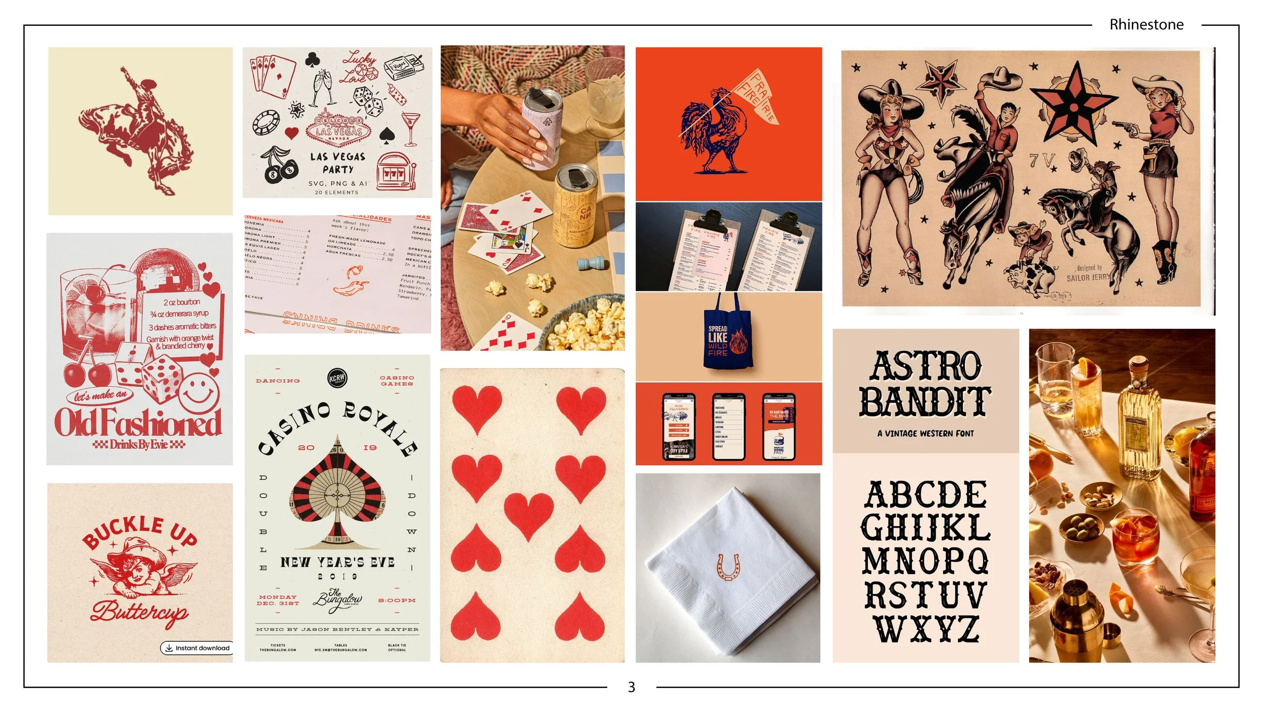Rhinestone was intended from the start to have a DIY punk aesthetic inspired by the scrappy way chefs need to forge their own way in a food industry where new concepts are usually backed by well-to-do investors. The main inspiration for the branding was inspired by event flyers made with a limited color printing palette. What started off as a red accent color (inspired by tattoo flash) shifted more into orange tones to inspire hunger, and the parchment and dusty black colors evoke the old west cow-boy theming. Both the logo and the heading type have a hand-painted sign quality, while most of the copy has an easy to read modern font. Flavor text and direct messaging is used sparingly with a simple hand drawn script. Clip art graphics from old western comic books are used but treated with colors and textures to match the hand processed punk aesthetic of old flyers. Because of the color palette I wanted to avoid using a literal rhinestone in the branding and instead created a unicorn-bronco that, while not part of the actual logo, is used along side of it let everyone know the personality of the place.